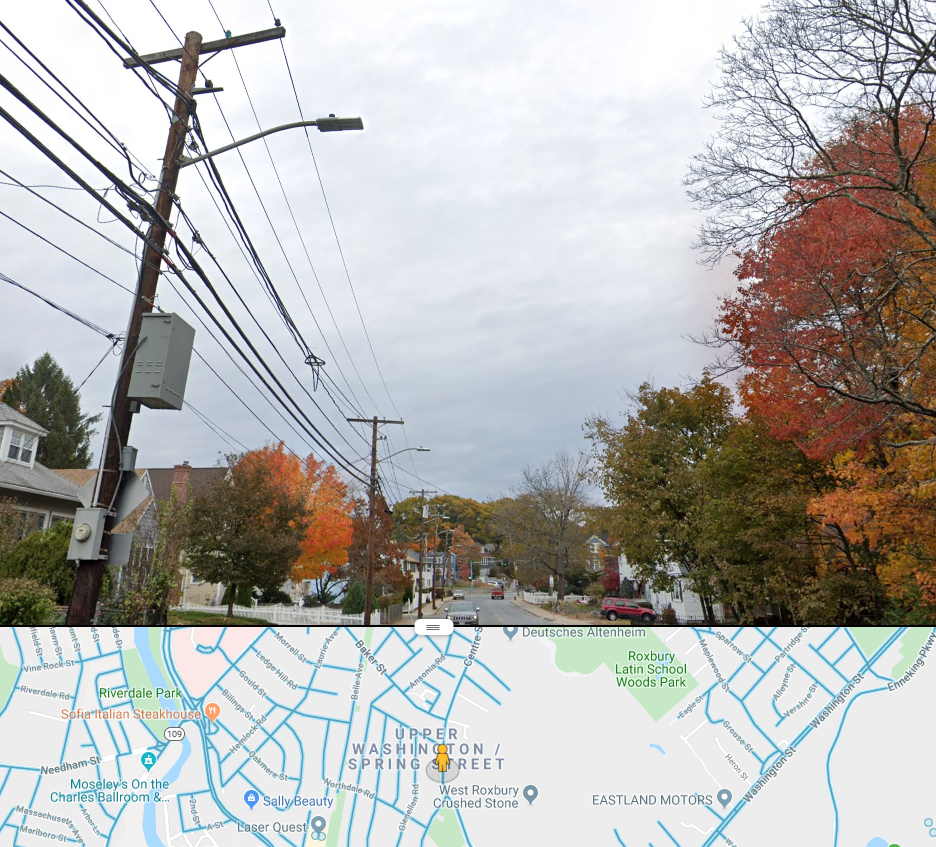 To explore whether this sparsity was in fact missing data, we investigated Google Street View to explore some of these West Roxbury streets. We found that these streets do indeed have streetlights (as is shown in the photograph below) confirming that this dataset is not a complete representation of streetlights in Boston. This missing streetlight data has the potential of skewing any model that uses this information as a predictor.