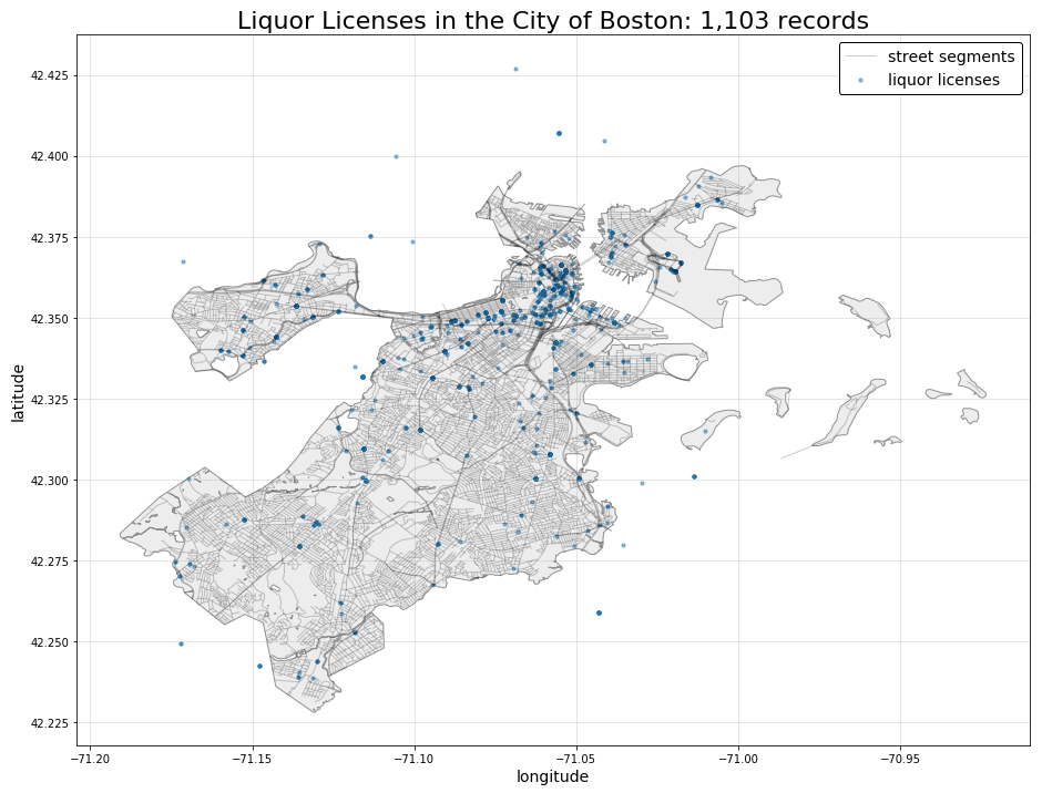 Examining liquor licenses in Boston took a fair amount of data cleansing efforts to transform incomplete addresses to latitude and longitude. We have successfully processed over 1,100 liquor license records and plotted them in the figure below: