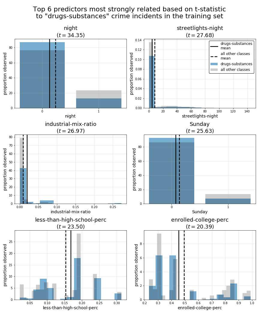 Outlined below are the top 6 predictors, as measured using t-statistic for each crime-type class: